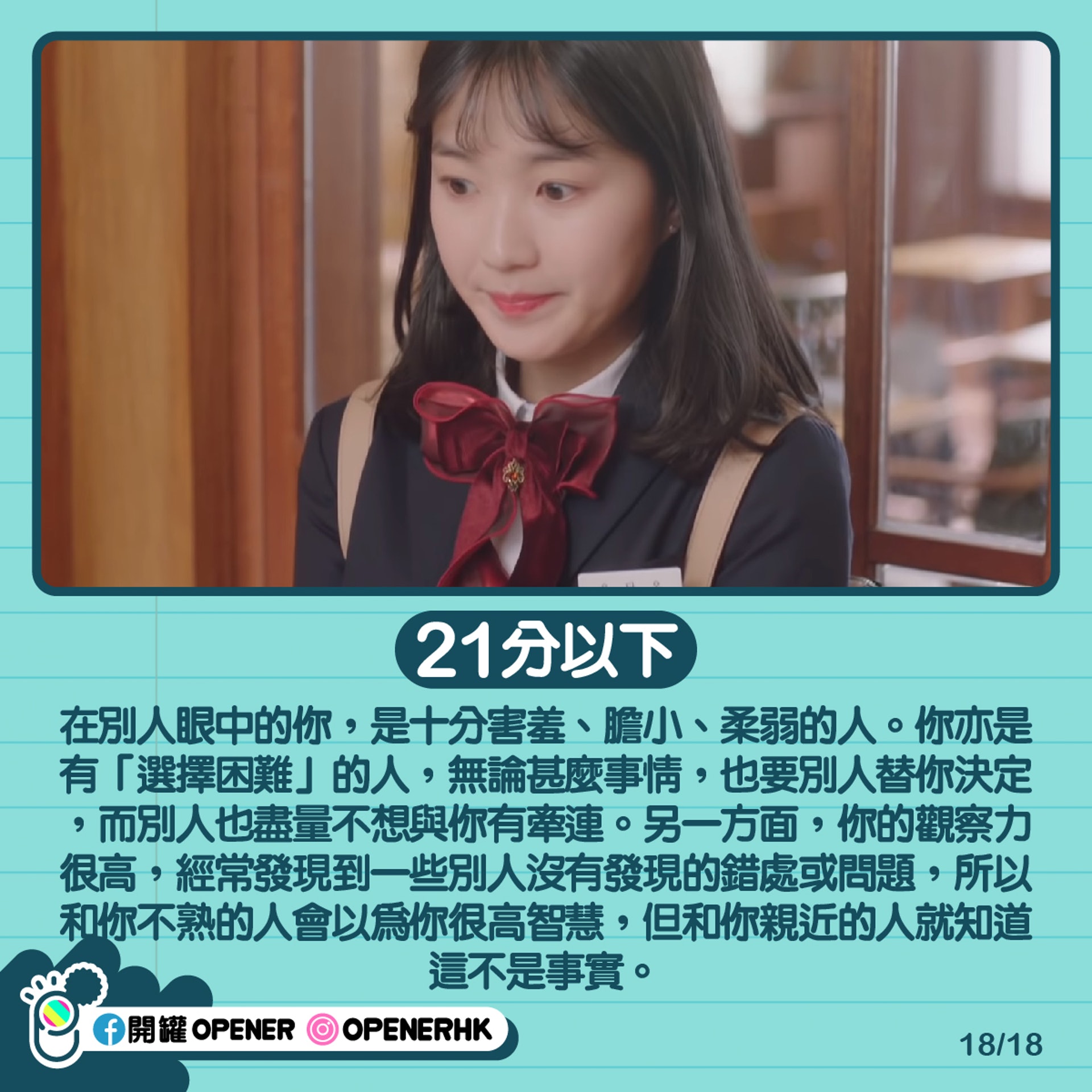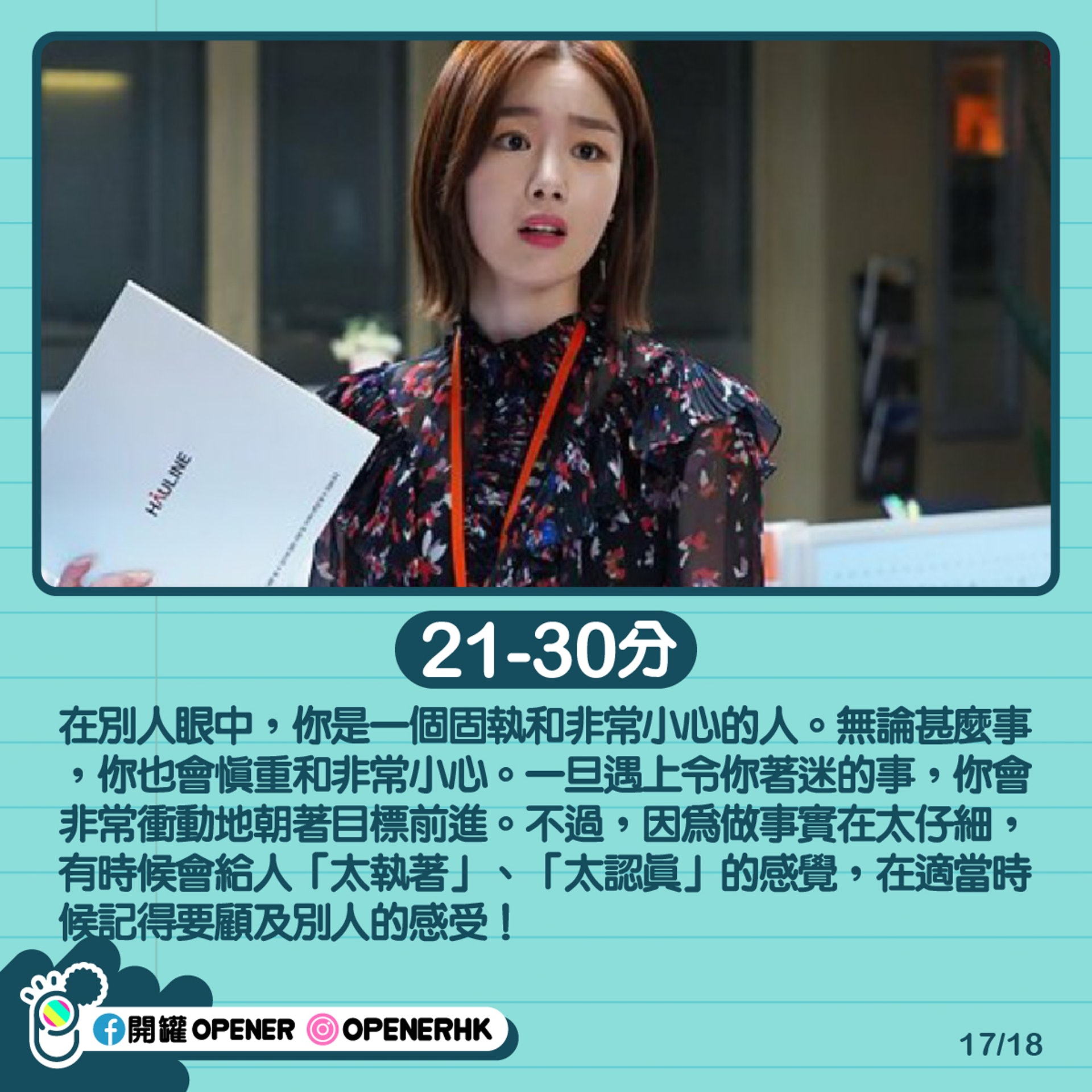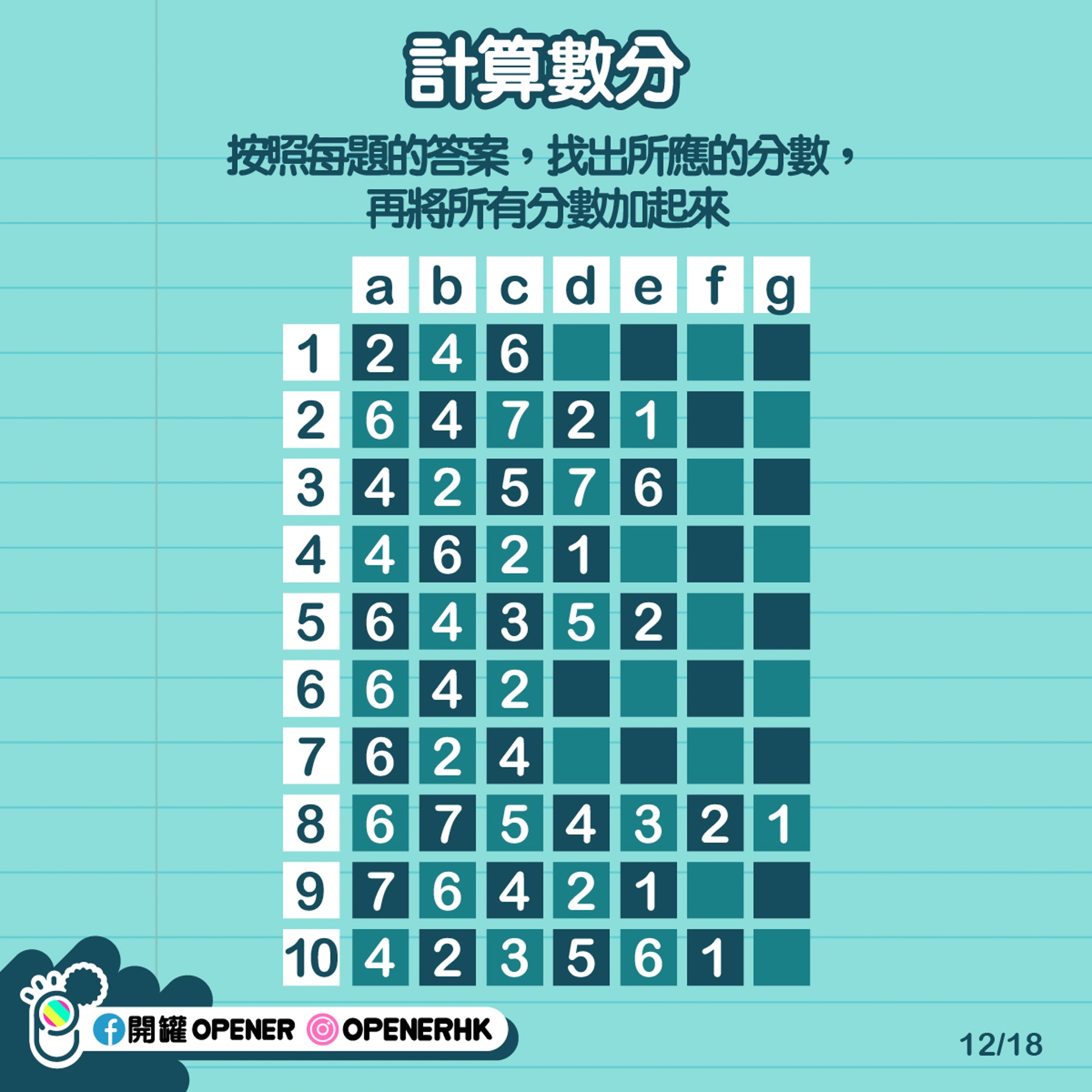 大家都有記下各條的答案吧?記下來之後,對應每題的分數,將它們加起來,就可以查看結果了!
